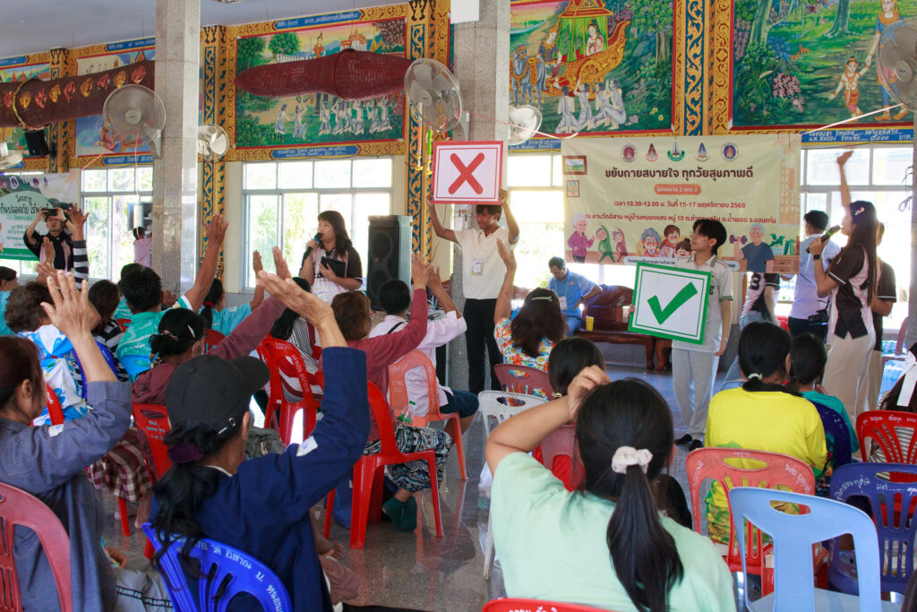 เมื่อเข้าสู่ช่วงท้ายของกิจกรรม ได้มีการให้ผู้เข้าร่วมแบบทดสอบท้ายกิจกรรม โดยพิธีกรจะอ่านคำถามและให้สัญญาณให้ผู้เข้าร่วมได้ยกมือตอบตามป้ายว่าถูกหรือผิด และนอกจากนั้นยังมีแบบทดสอบท่าทางการออกกำลังกายเพื่อวัดความเข้าใจหลังจบการให้ความรู้พร้อมจับฉลากและมอบของรางวัลให้กับผู้โชคดี