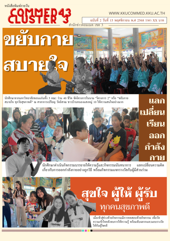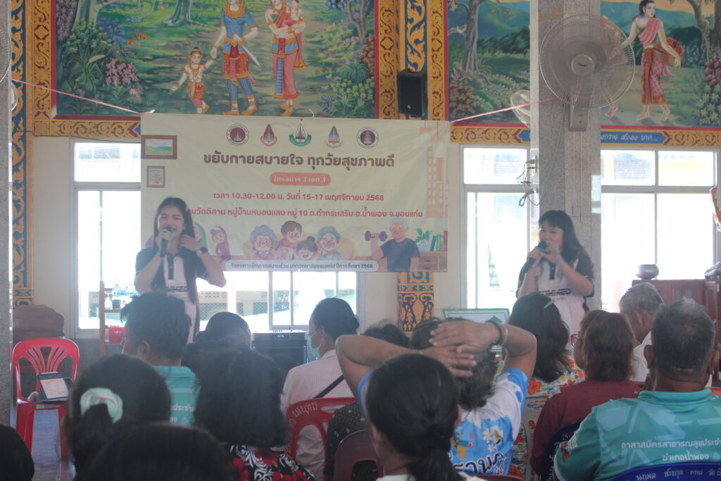 ในวันที่ 15 พฤศจิกายน พ.ศ. 2568 นักศึกษาโครงการที่ 2 เริ่มดำเนินโครงการ ”ขยับกายสบายใจ ทุกวัยสุขภาพดี“ ตามที่ได้ประชาสัมพันธ์ไปในวันที่ 13 ซึ่งผู้เข้าร่วมกิจกรรมมีหลายช่วงอายุ ได้แก่ เด็ก ผู้ใหญ่ ผู้สูงอายุ ร่วมโครงการทั้งหมดกว่า 60 คน ฟังบรรยายให้ความรู้และทำกิจกรรมนันทนาการ แลกเปลี่ยนความคิดเกี่ยวกับการออกกำลังกายอย่างถูกวิธี เพื่อสร้างความสนิทสนมและลดความตึงเครียดก่อนจะเริ่มโครงการ