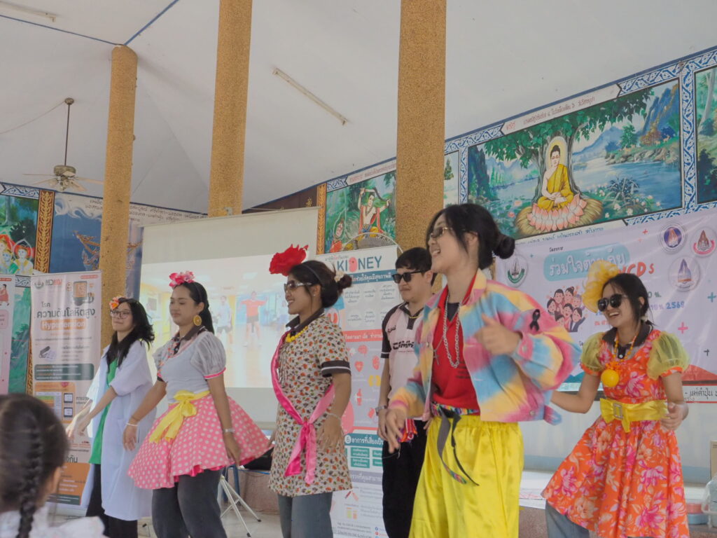 เวลา 14.00-15.00 น. นำเสนอข้อมูลโดยมีการแสดงละครสั้น สอดแทรกให้เห็นถึงอันตราย และเน้นการให้ความรู้เกี่ยวกับโรคไม่ติดต่อ เช่น โรคเบาหวาน ความดัน หรือโรคหัวใจ โดยมุ่งเน้นเกี่ยวกับการดูแลและป้องกัน เนื่องจากพบว่าชุมชนนี้มีผู้ป่วยโรค NCD สูง ทำให้เกิดความตั้งใจที่จะส่งเสริมให้ชาวบ้านตระหนักถึงความรุนแรงที่ส่งผลต่อสุขภาพ การใช้ชีวิต และยังสามารถนำไปป้องกันเพื่อลดความเสี่ยงในการเกิดโรค NCD ได้