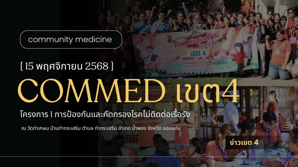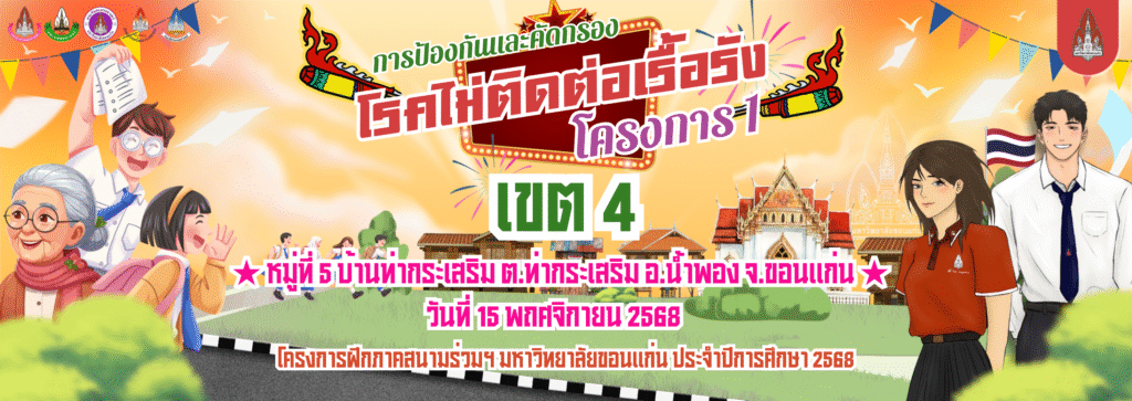 วันที่ 15 พฤศจิกายน 2568 คณะทำงานโครงการ 1 เขต 4 มหาวิทยาลัยขอนแก่น ลงพื้นที่ชุมชนบ้านท่ากระเสริม อำเภอน้ำพอง จังหวัดขอนแก่น เพื่อดำเนินกิจกรรมตรวจคัดกรองโรคไม่ติดต่อเรื้อรัง (NCDs) โดยมุ่งเน้นการค้นหากลุ่มเสี่ยงโรคเบาหวานและความดันโลหิตสูง ควบคู่กับการส่งเสริมความรู้ด้านสุขภาพที่ถูกต้อง เพื่อให้ประชาชนสามารถดูแลตนเองและป้องกันโรคได้อย่างยั่งยืนกับโครงการ “การป้องกันและคัดกรองโรคไม่ติดต่อเรื้อรัง”