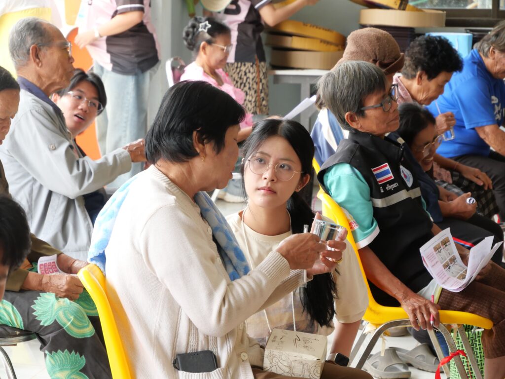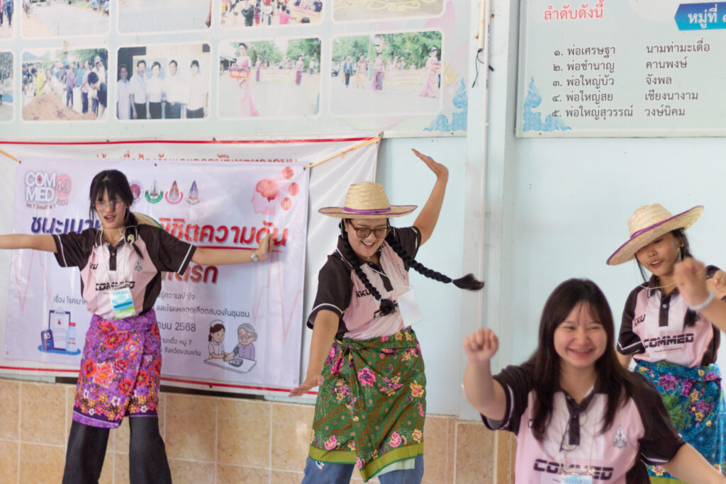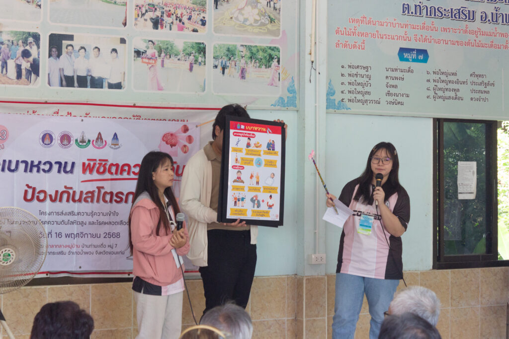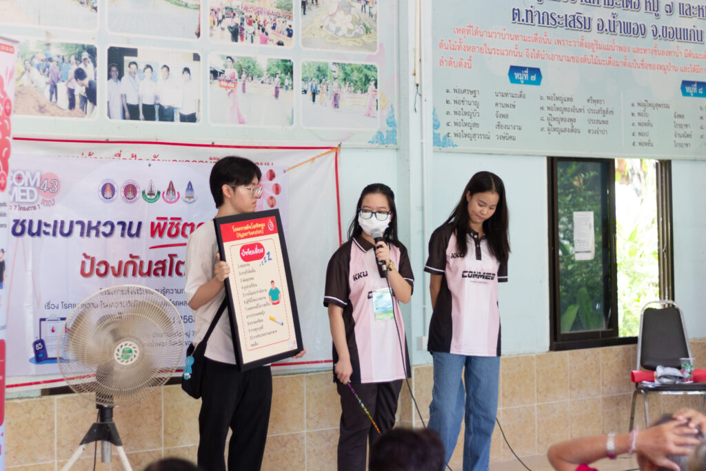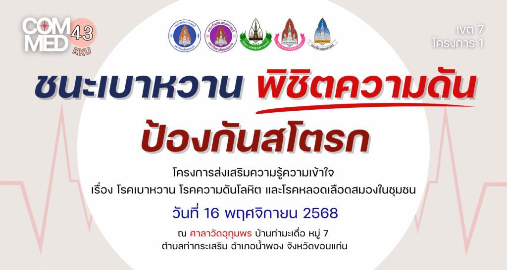 ในวันอาทิตย์ที่ 16 พฤศจิกายน 2568 นักศึกษาสายวิทยาศาสตร์สุขภาพทั้ง 5 คณะและคณาจารย์ โครงการ 1 เขตที่ 7 มหาวิทยาลัยขอนแก่น ได้ลงพื้นที่จัดกิจกรรมฝึกอบรมเชิงปฏิบัติการให้ความรู้แก่ชุมชนภายใต้ชื่อโครงการ “ ชนะเบาหวาน พิชิตความดัน ป้องกันสโตรก “ เพื่อสร้างความตระหนักรู้ให้ประชากรในชุมชนเข้าใจถึงสาเหตุ อาการ การป้องกัน และการดูแลสุขภาพตนเองอย่างถูกวิธี รวมทั้งส่งเสริมให้เกิดการปรับเปลี่ยนพฤติกรรมสุขภาพในชีวิตประจำวัน ซึ่งจะช่วยลดความเสี่ยงของการเกิดโรคและภาวะแทรกซ้อนต่าง ๆ ส่งผลให้ประชากรในชุมชนมีสุขภาพที่ดีขึ้นและลดความเสี่ยงจากโรคในระยะยาว